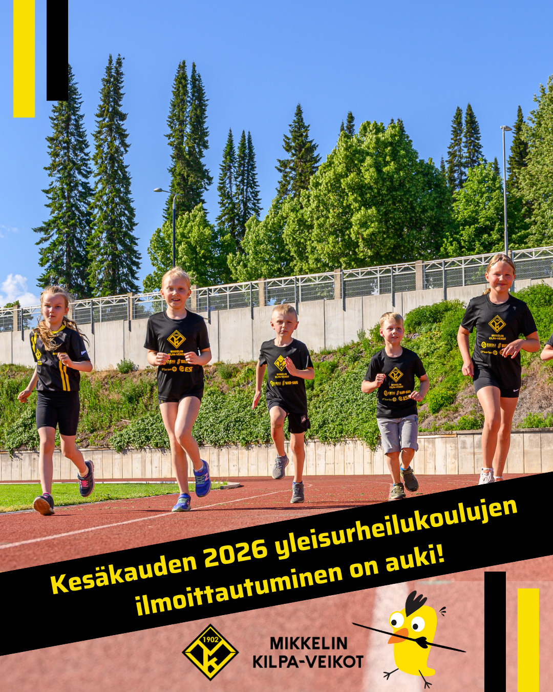 Kesä lähestyy vauhdilla – ja se tarkoittaa yhtä asiaa: Mikkelin Kilpa-Veikkojen suositut yleisurheilukoulut ovat pian taas täällä! 🖤💛